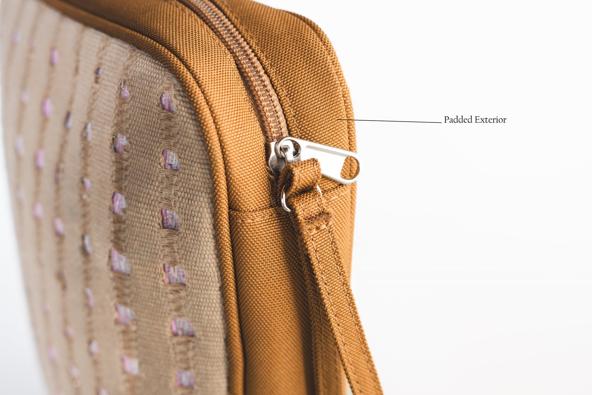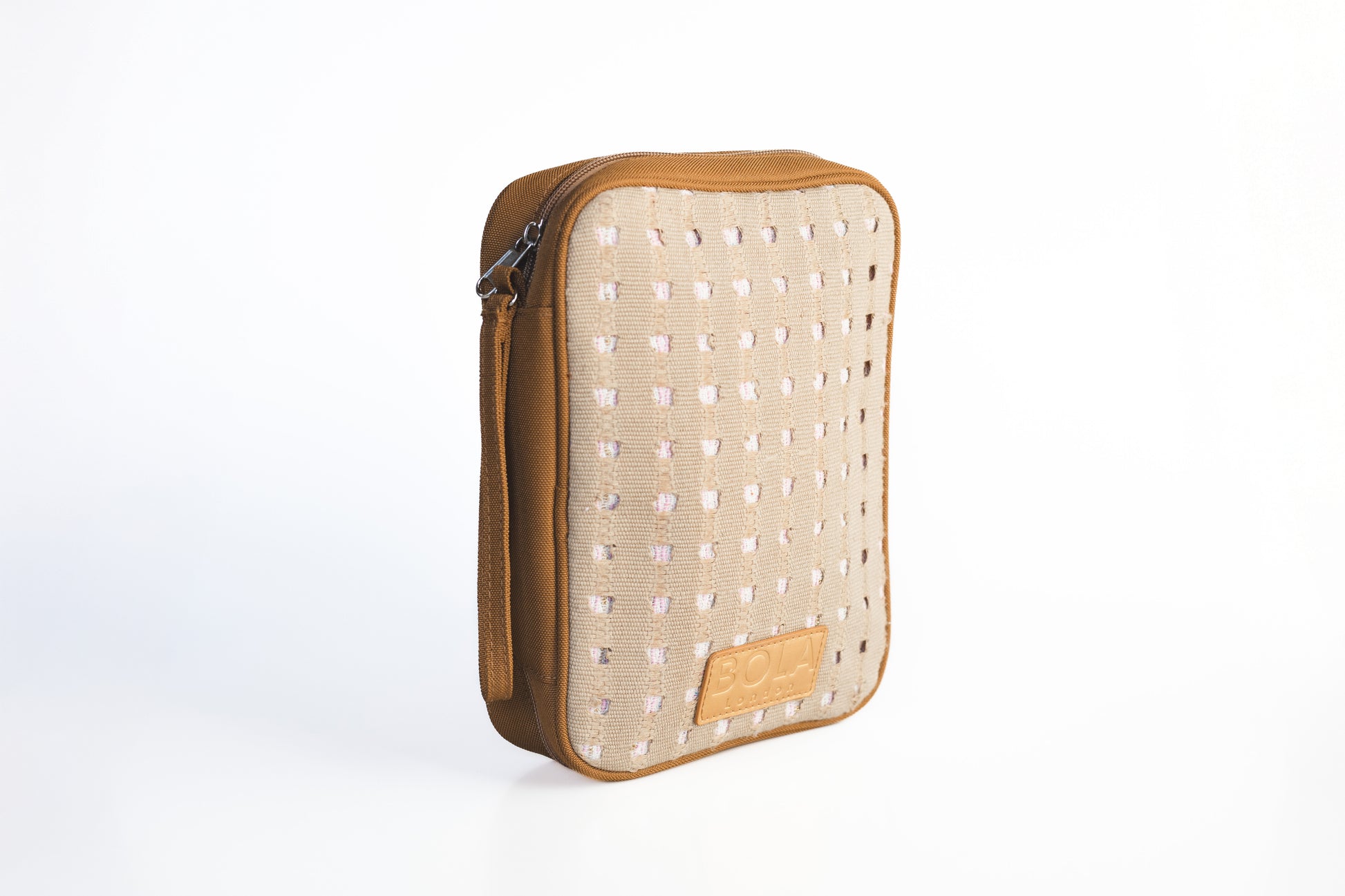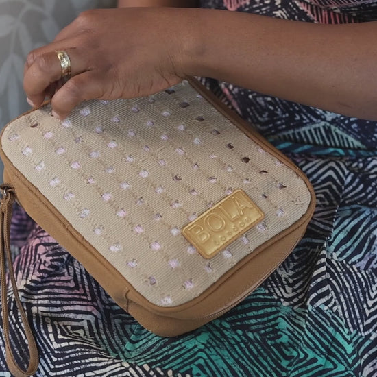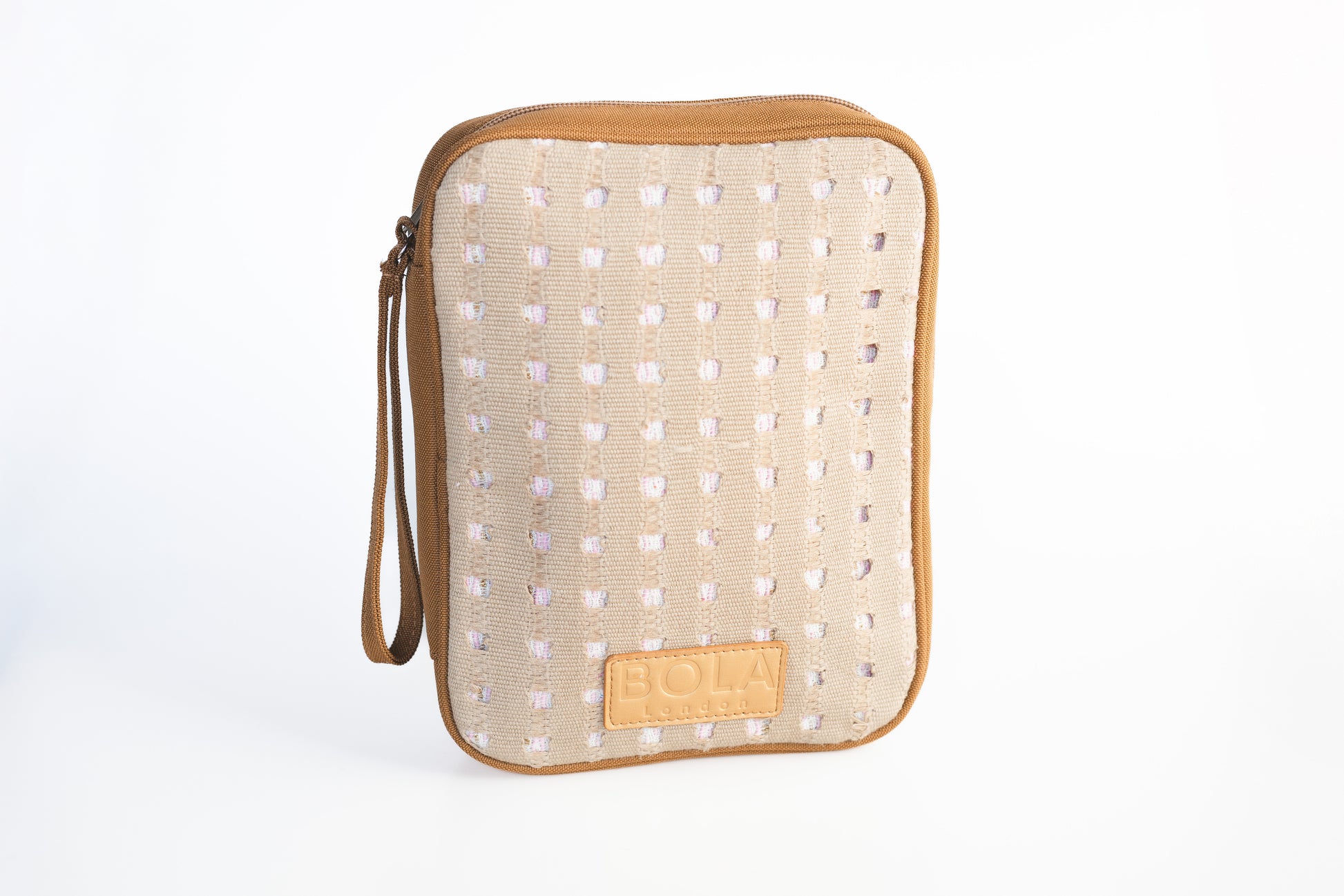 Handcrafted in premium tan leather with a soft, textured finish, our tech organisers are distinguished by a striking panel of Aṣọ Òkè, a traditional Yoruba handwoven textile known for its ceremonial and cultural significance. The diagonal stripes and colours of the Aṣọ Òkè textile add boldness and elegance while grounding the piece in rich cultural heritage.