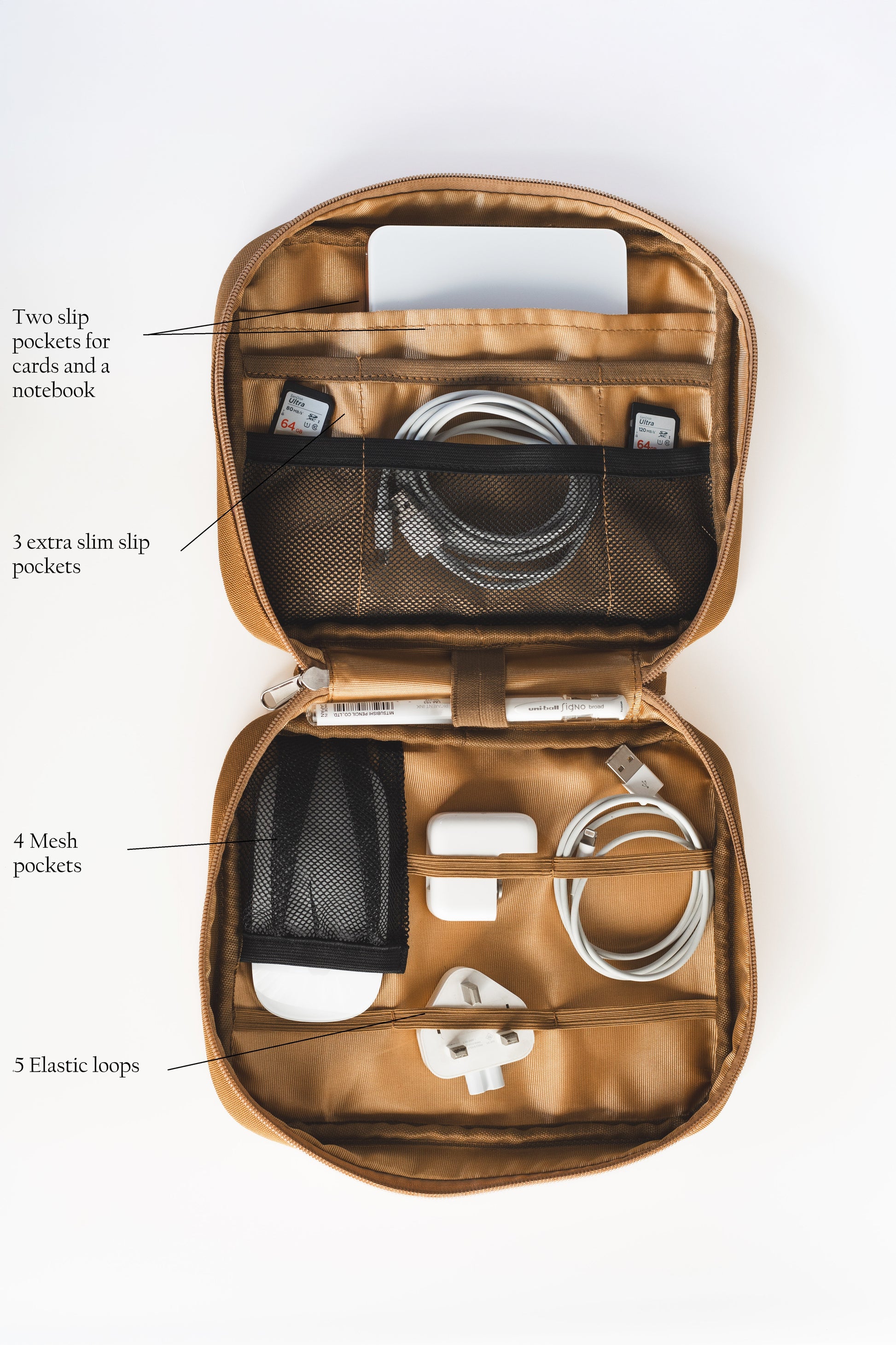 • Multiple compartments for organising tech cables, cards, and accessories.