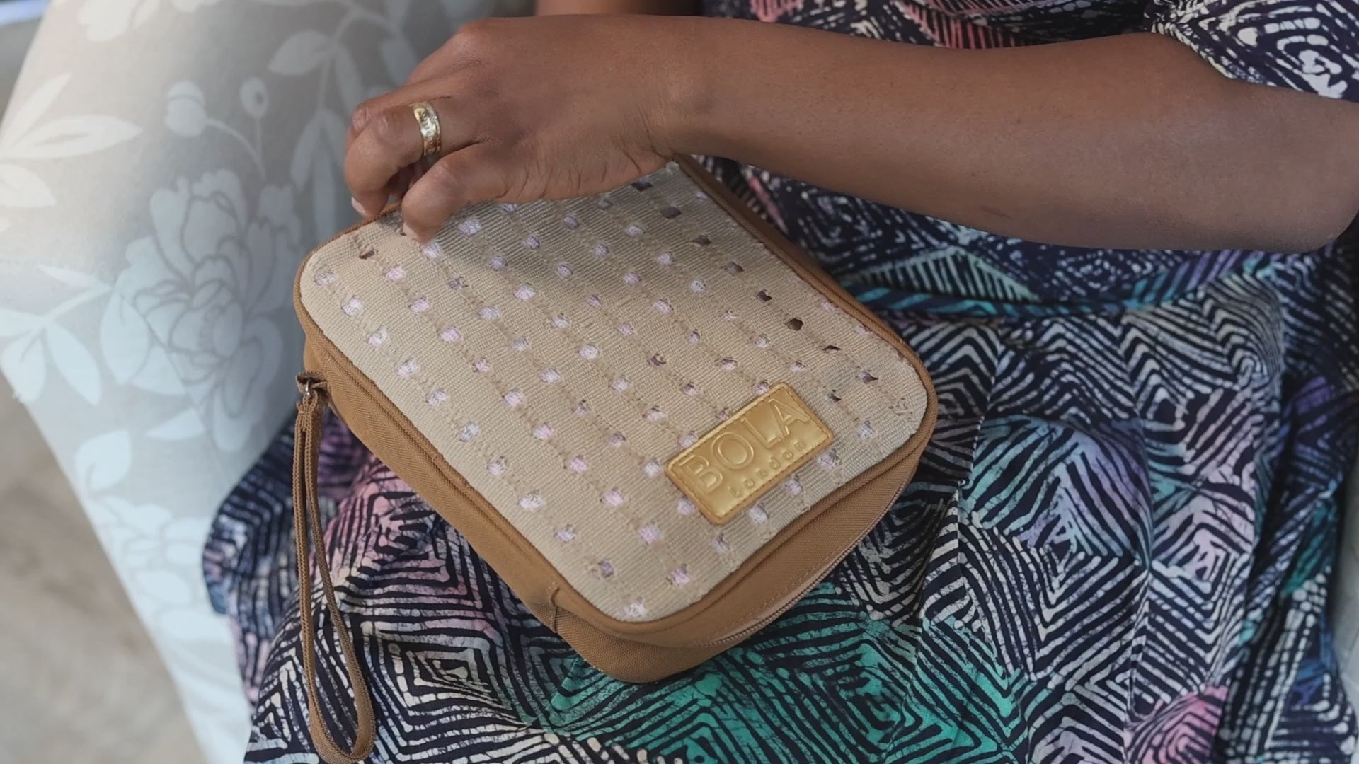 This sleek tech organizer, crafted from a beautiful gold and pink blend of jawu aso oke, tweed, and Oxford fabric, keeps all your gear in place and your cables under control. Elastic loops keep your cords and chargers neatly secured, while the mesh pockets are perfect for flash drives and memory cards. The spacious slip pocket holds your notebook and hard drives, and the inner pocket is just right for your ATM cards. Stay organized in style!